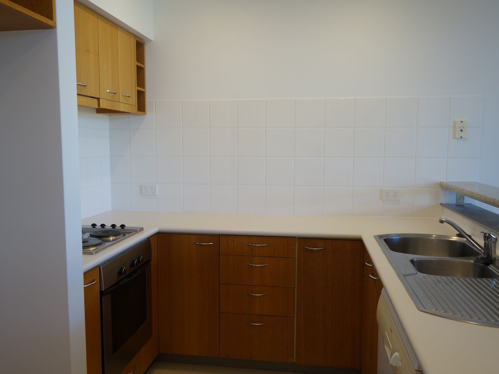 • Modern well-appointed kitchen with timber veneer cabinetry, white counters, granite bar and dishwasher, under bench oven and cooktop